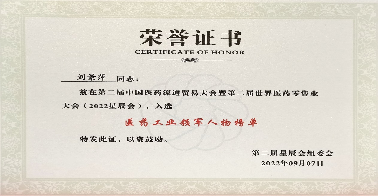 本次星辰会期间,尊龙凯龙时人生就是博网址斩获颇丰,获得多项行业奖项及荣誉。在开幕式上,刘景萍董事长荣获“医药工业领军人物”称号。